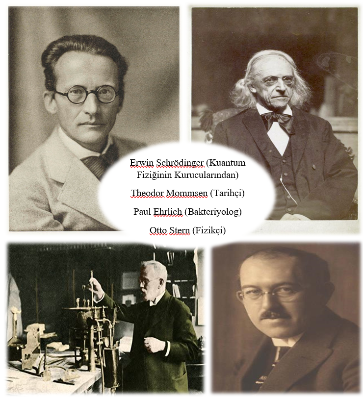 sol üstten sağ alta doğru: Erwin Schrödinger, Theodor Mommsen, Paul Ehrlich, Otto Stern (Wroclaw Üniversitesi’nden mezun, Nobel Ödüllü bilim insanlarından bazıları)